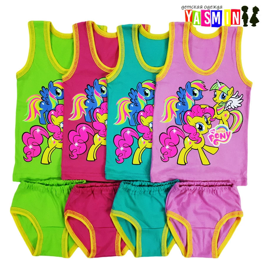 Комплект выполнен в ярких цветах, которые приятны глазу. На майку нанесен принт мультяшного героя "Пони". Такой милый и красивый комплект гарантированно понравится вашей малышке. А вы оцените прочность и надёжность кроя, а также высокое качество трикотажа.